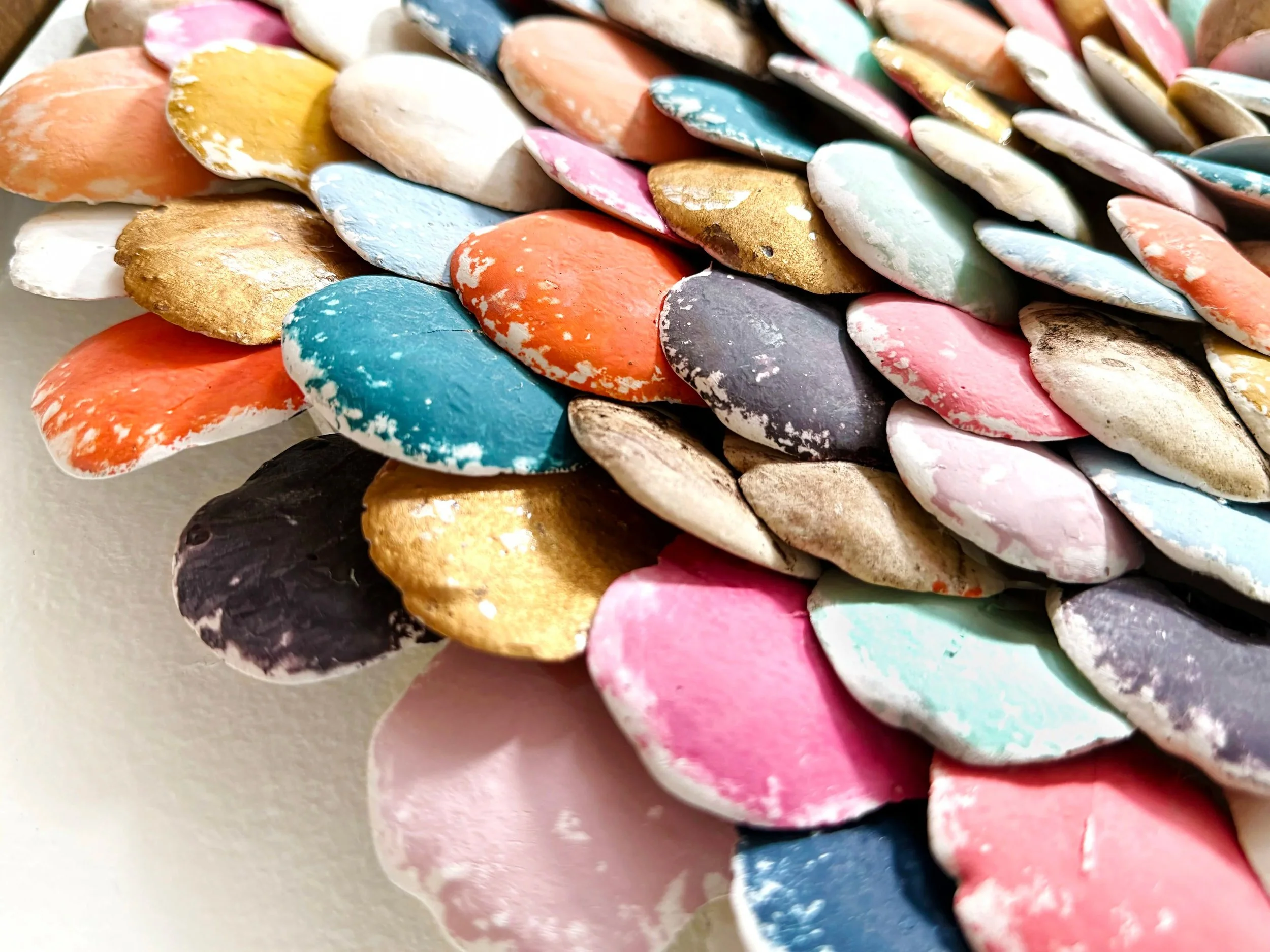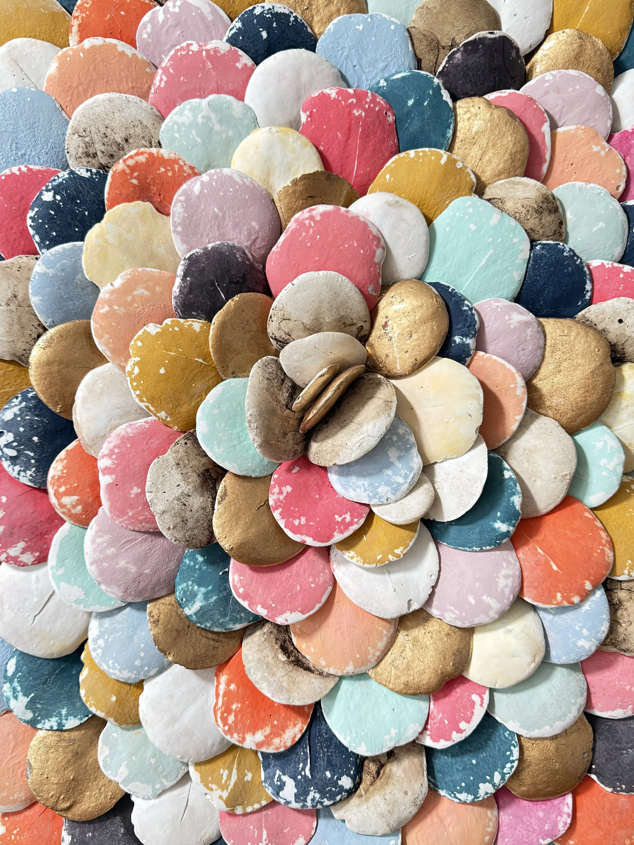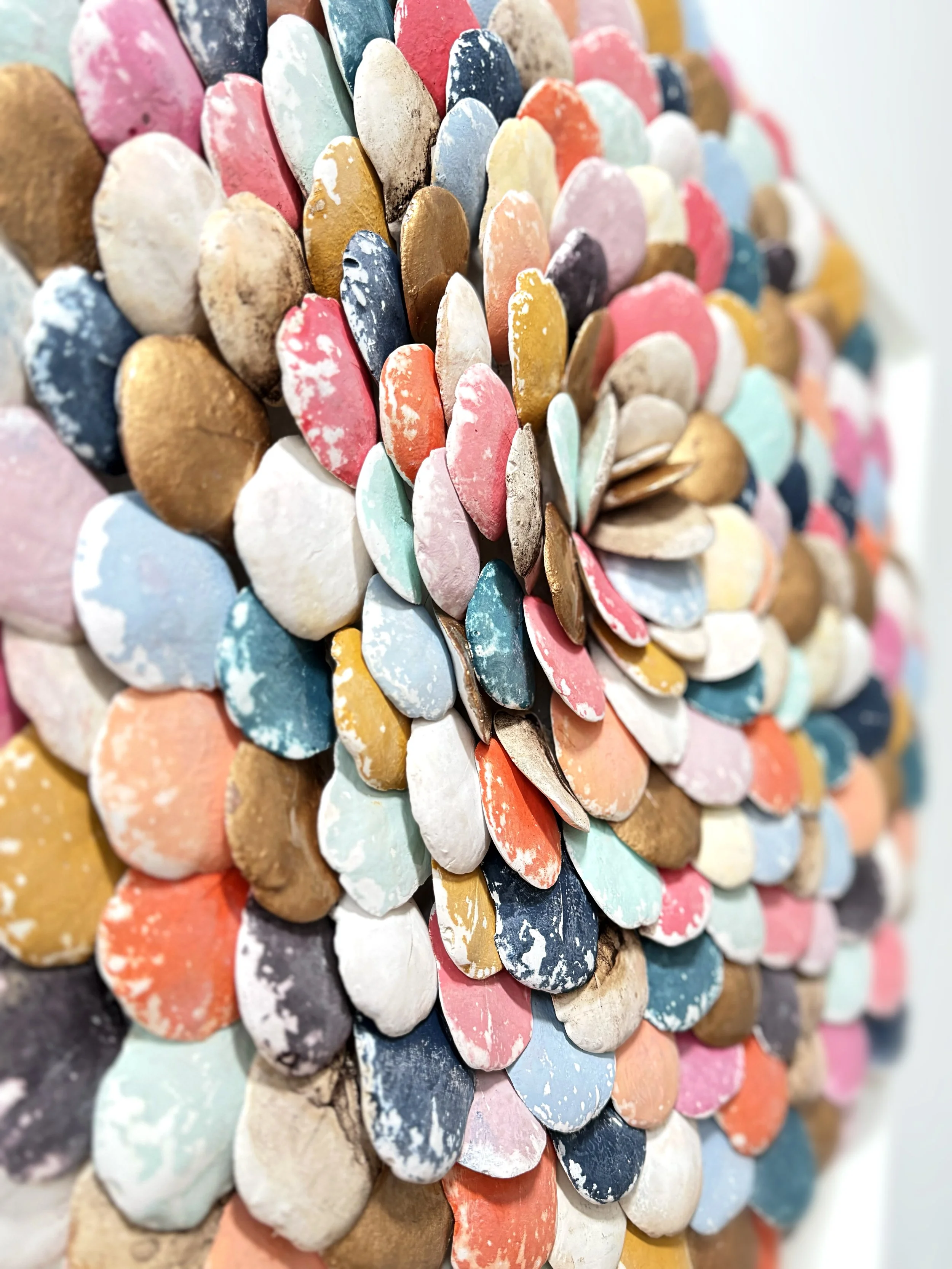 It symbolizes prosperity, wealth, good chi, and good fortune. I collected about 20 or so individual spoon-shaped leaves from the plant, took them back to my studio to make plaster casts of. Once hard and dry, I painted each, sanded them smooth, and created this wall sculpture.