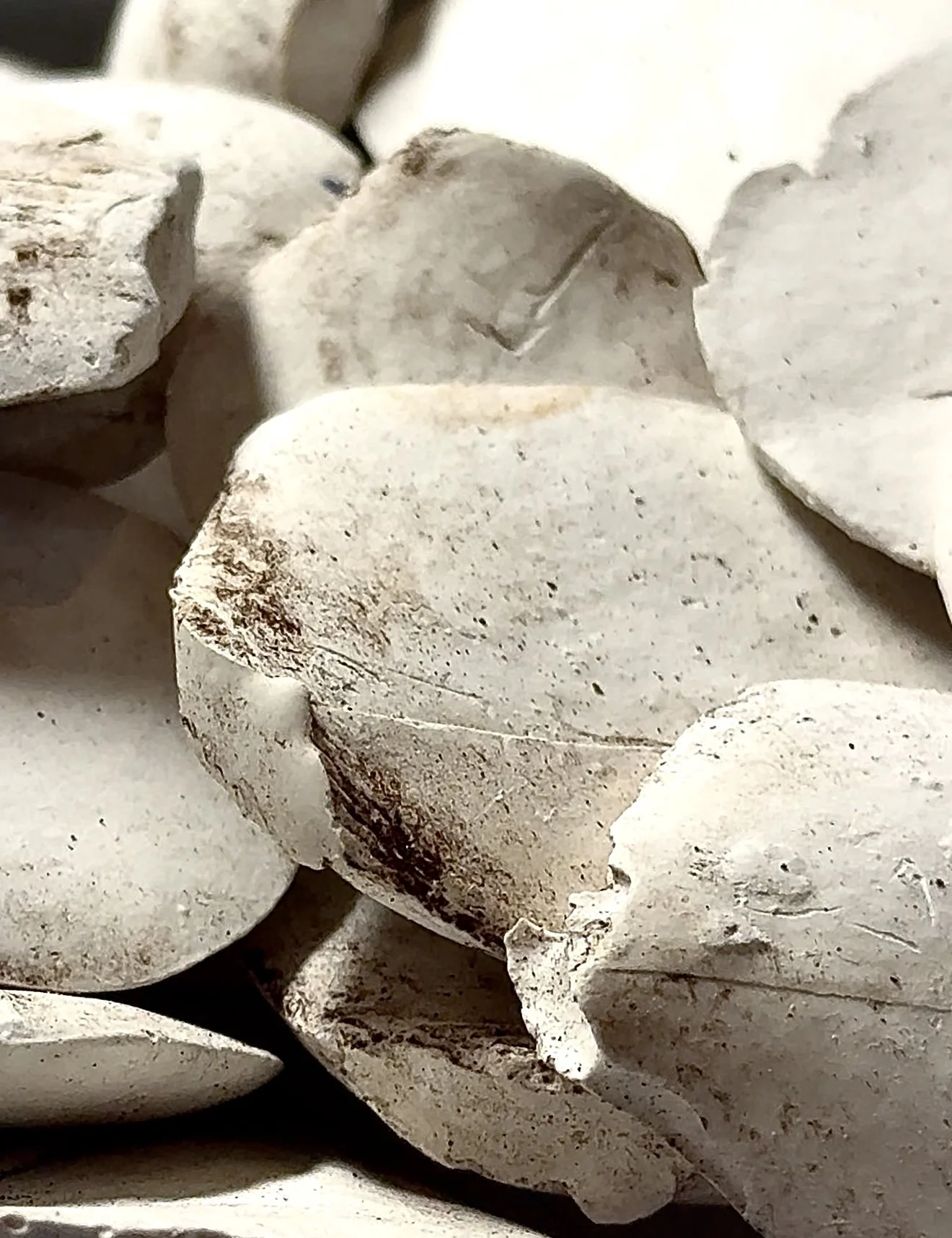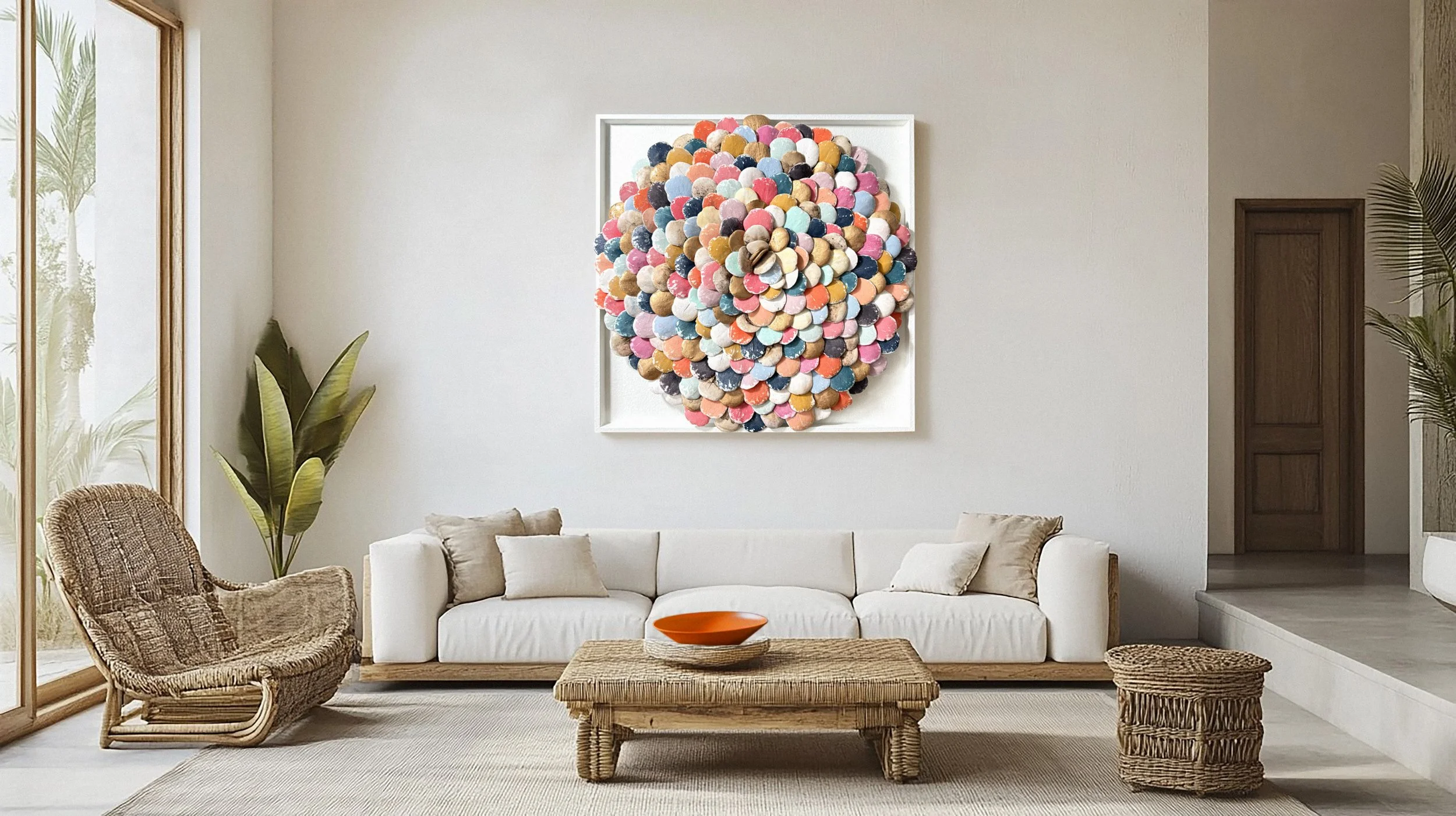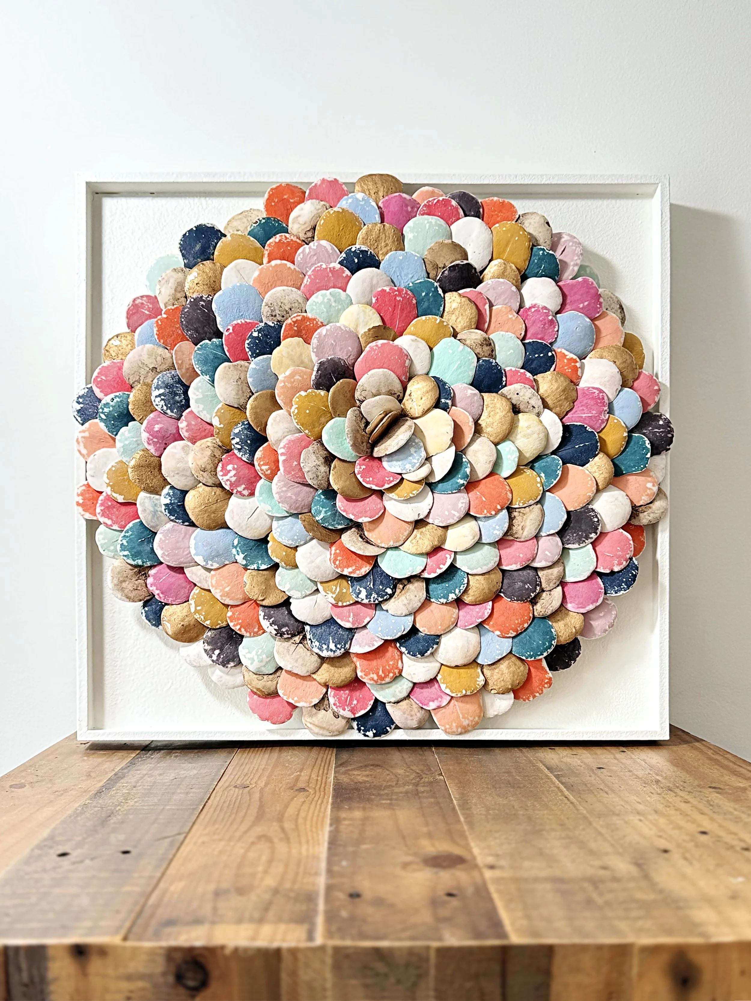 It symbolizes prosperity, wealth, good chi, and good fortune. I collected about 20 or so individual spoon-shaped leaves from the plant, took them back to my studio to make plaster casts of. Once hard and dry, I painted each, sanded them smooth, and created this wall sculpture.