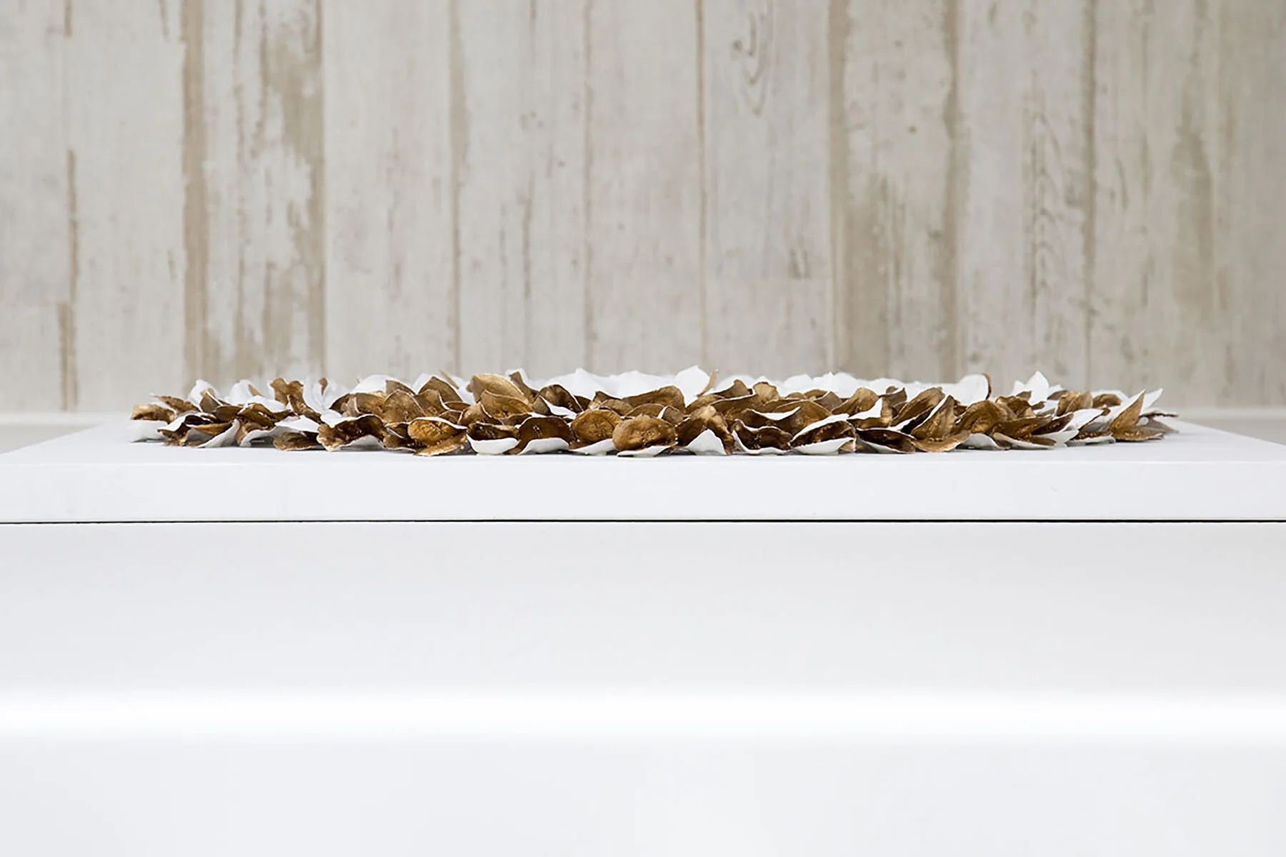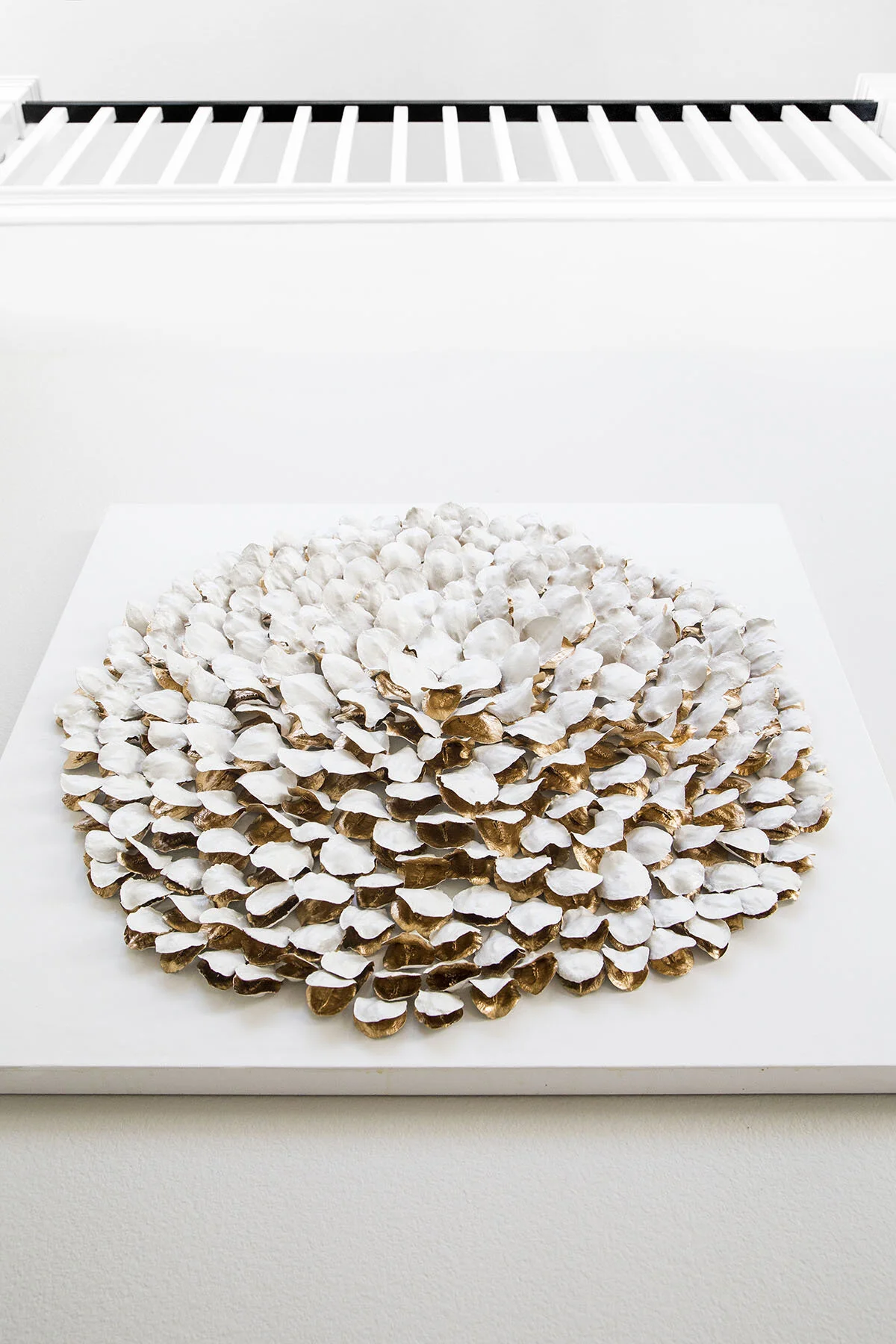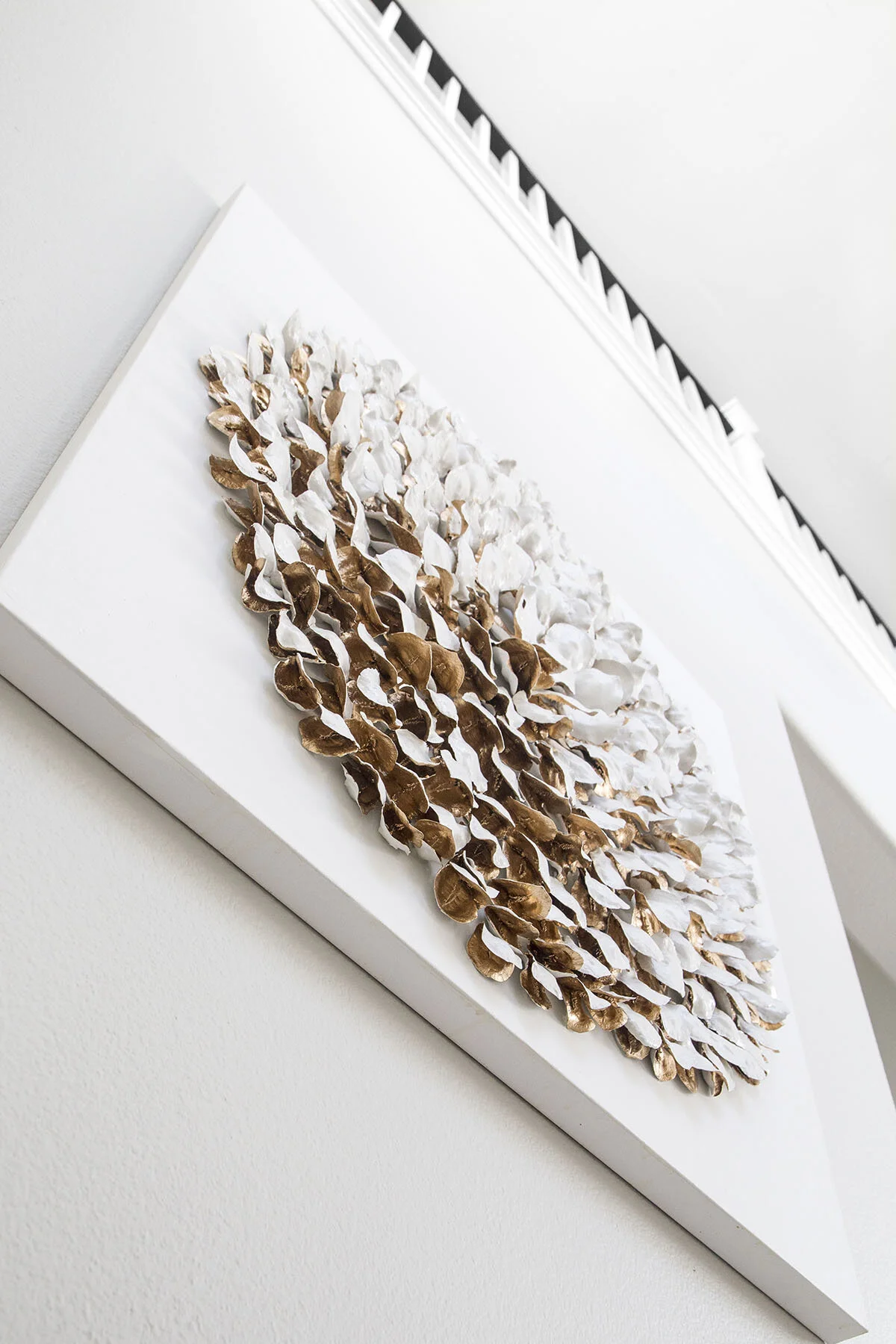 This piece is made up of the dried oblong fruit pods that fall from the fragrant Jacaranda tree. Once collected, these pods were soaked, scrubbed, sealed, and painted in white gloss acrylic and liquid gold leaf. The white-on-white, curving luminous patterns, undulating rhythms, and anatomic details of each pod reveal themselves anew as the viewer shifts positions around the piece.