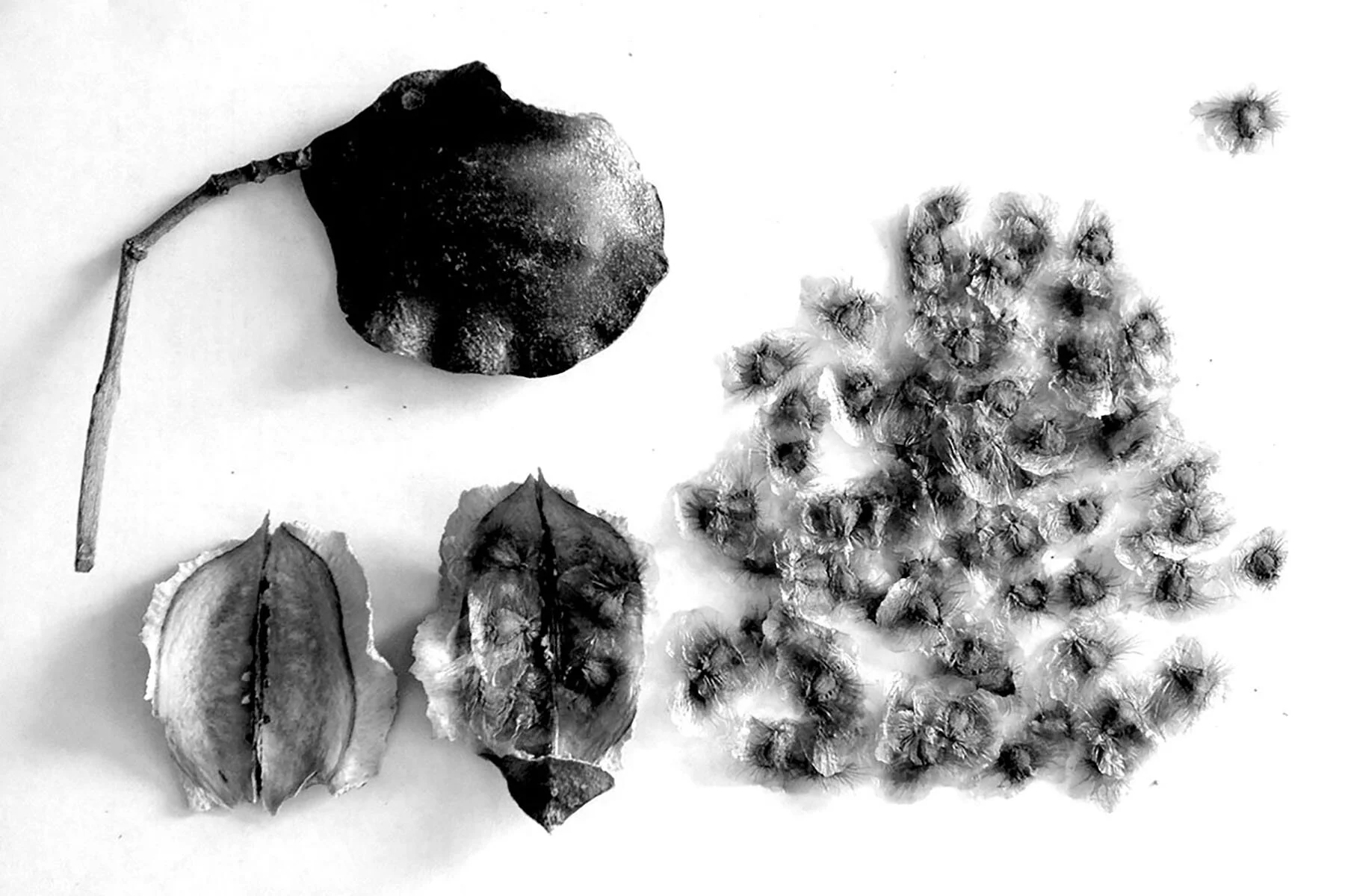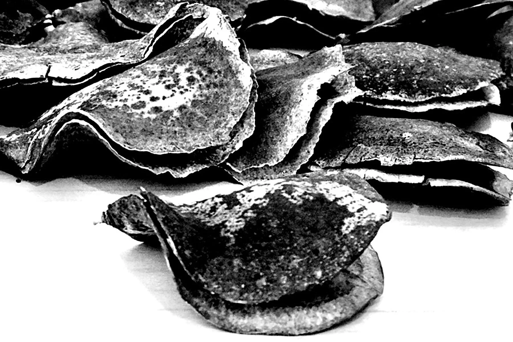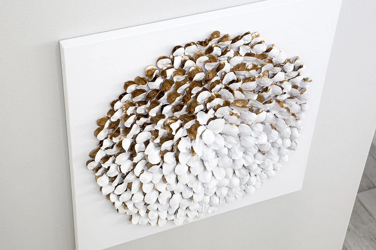 This piece is made up of the dried oblong fruit pods that fall from the fragrant Jacaranda tree. Once collected, these pods were soaked, scrubbed, sealed, and painted in white gloss acrylic and liquid gold leaf. The white-on-white, curving luminous patterns, undulating rhythms, and anatomic details of each pod reveal themselves anew as the viewer shifts positions around the piece.