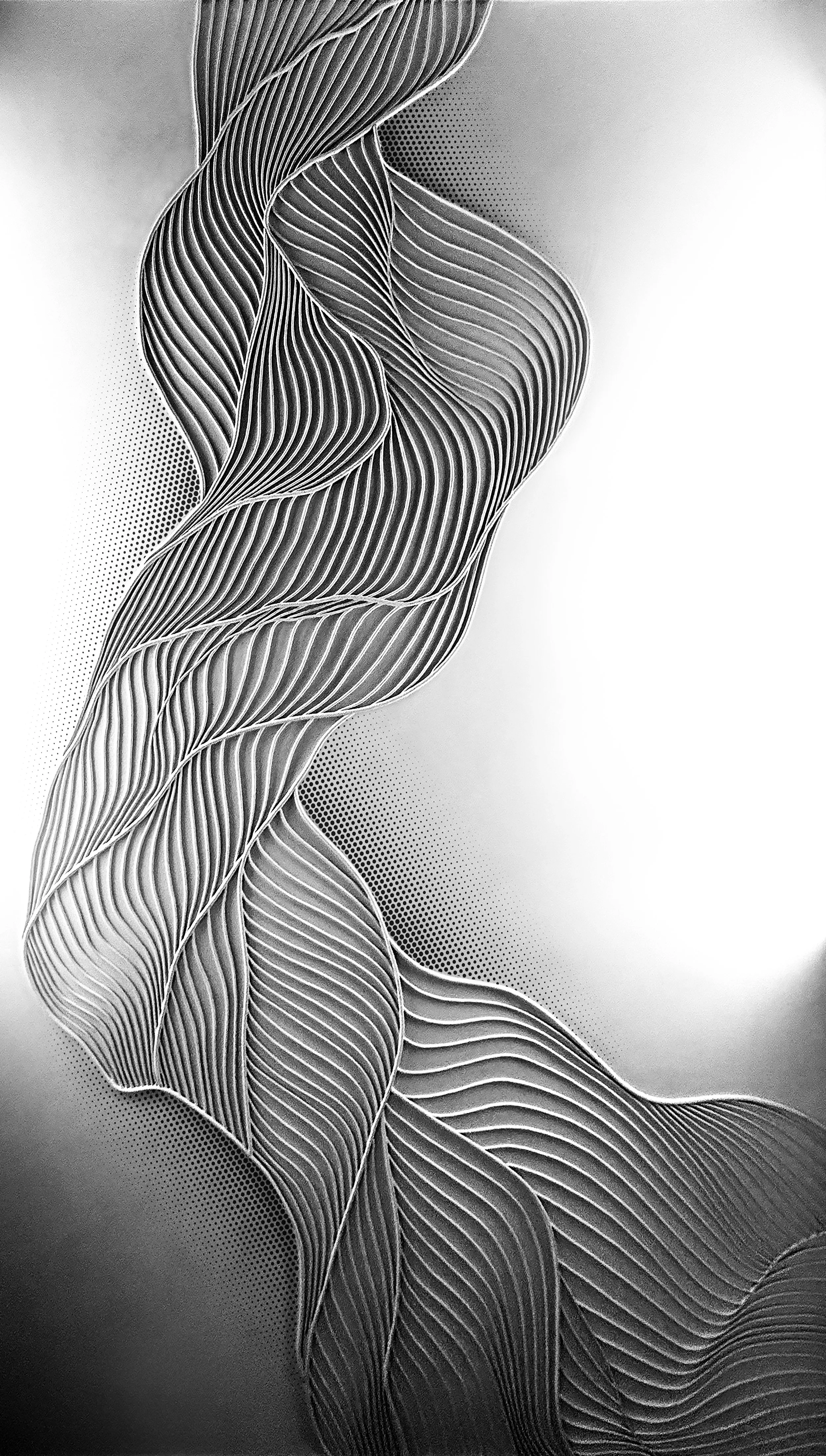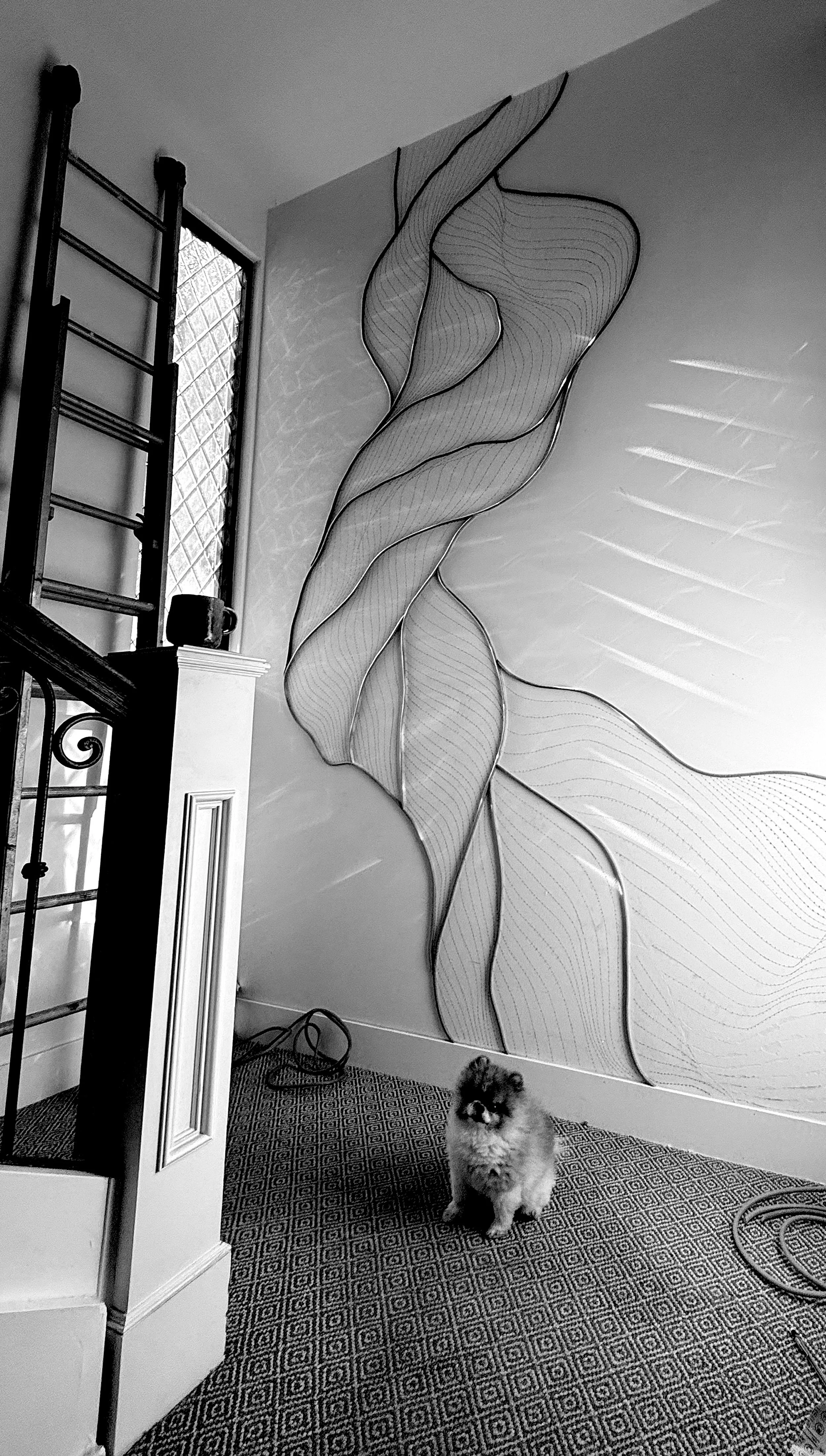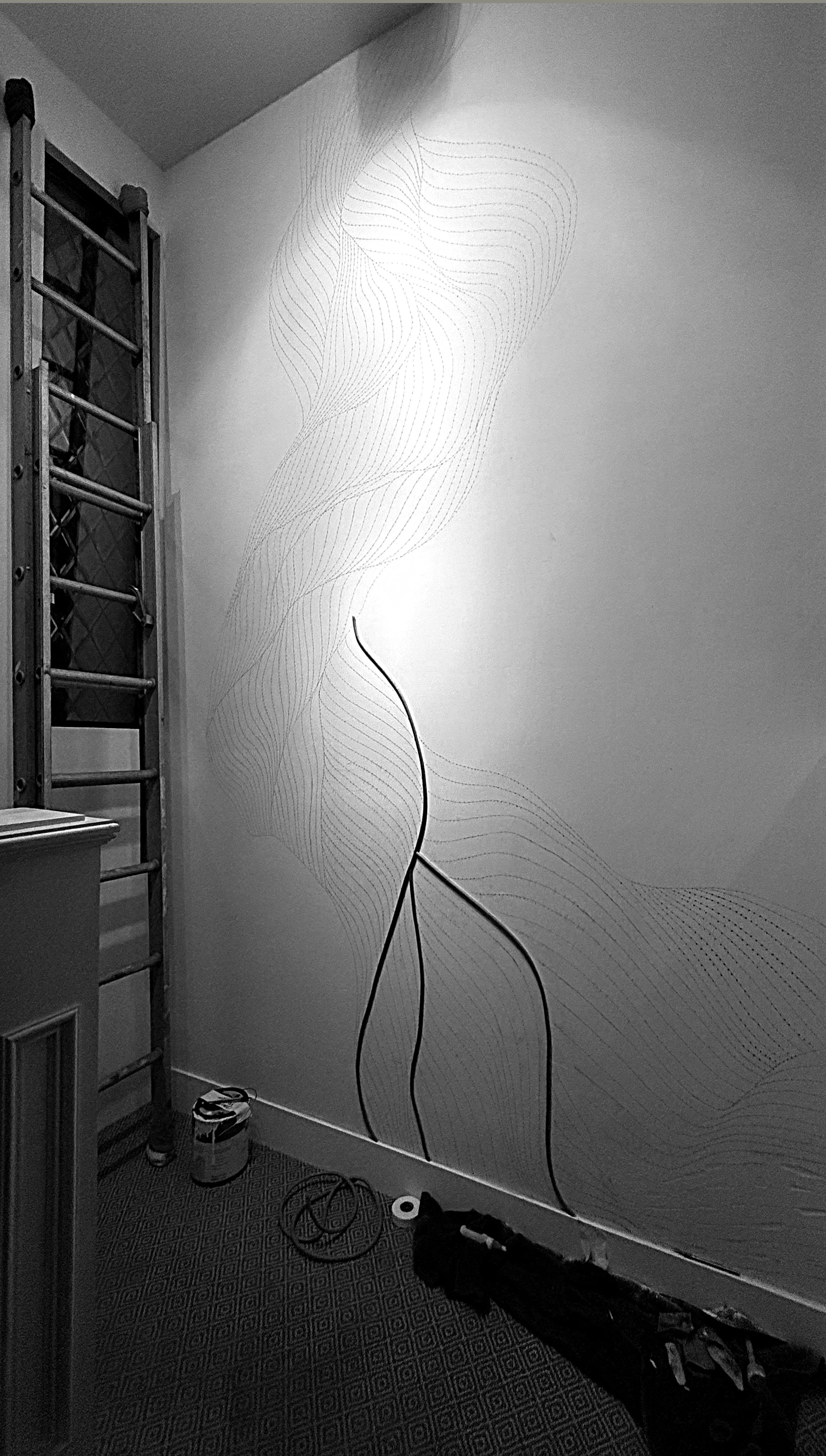 This wall sculpture took shape over several weeks, as I slowly traced what once was a little pencil doodle with cording, one inch at a time, one contour at a time, crest to trough to crest, finally applying a wash of white and dotting an illusory shadow in reflective liquid gold.