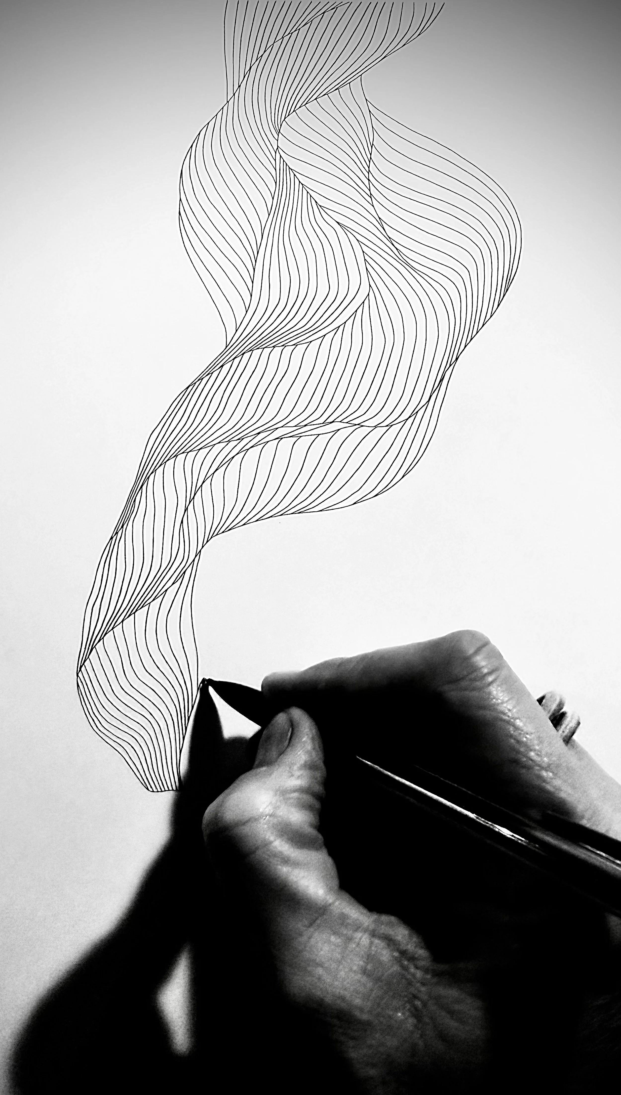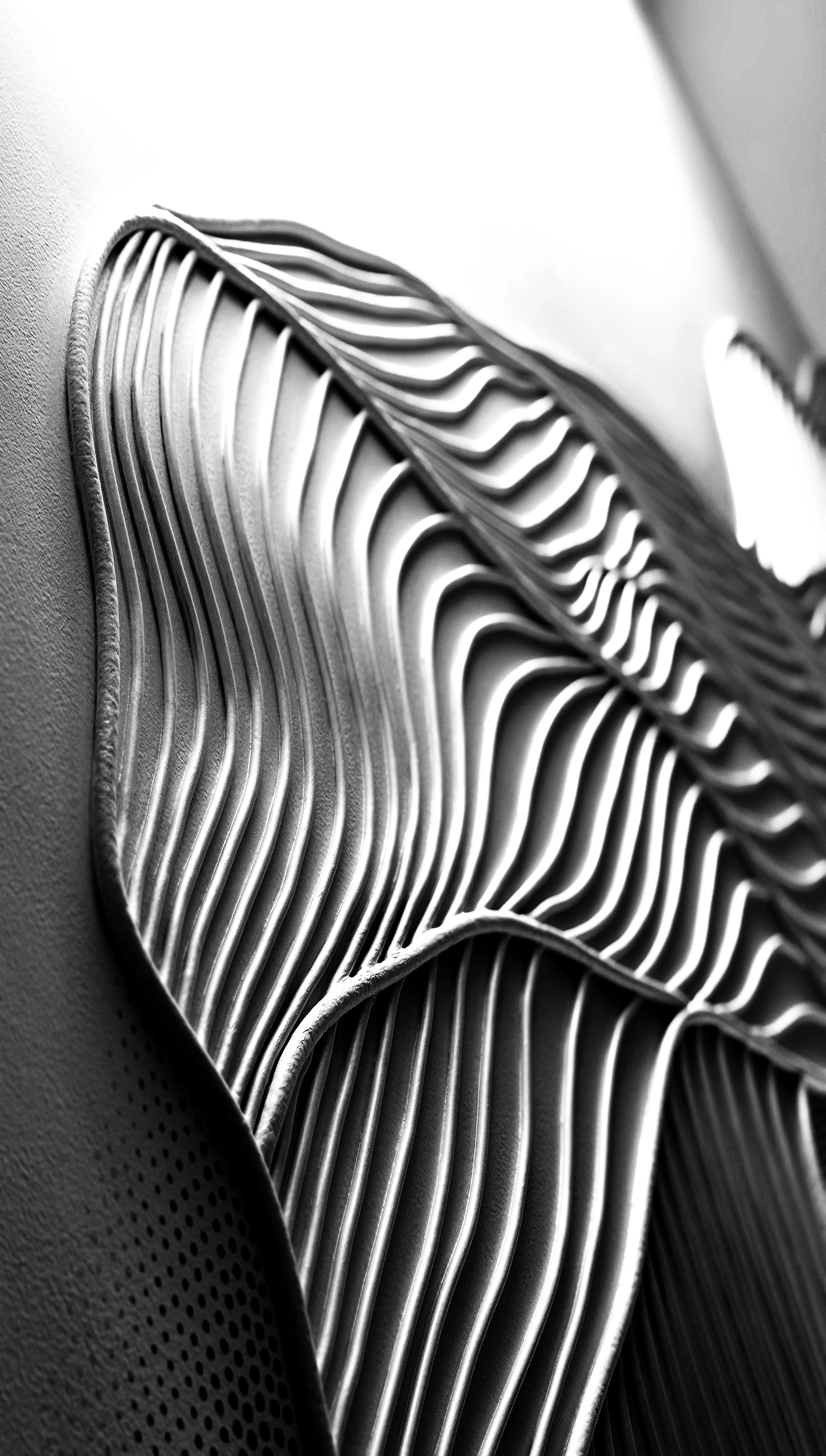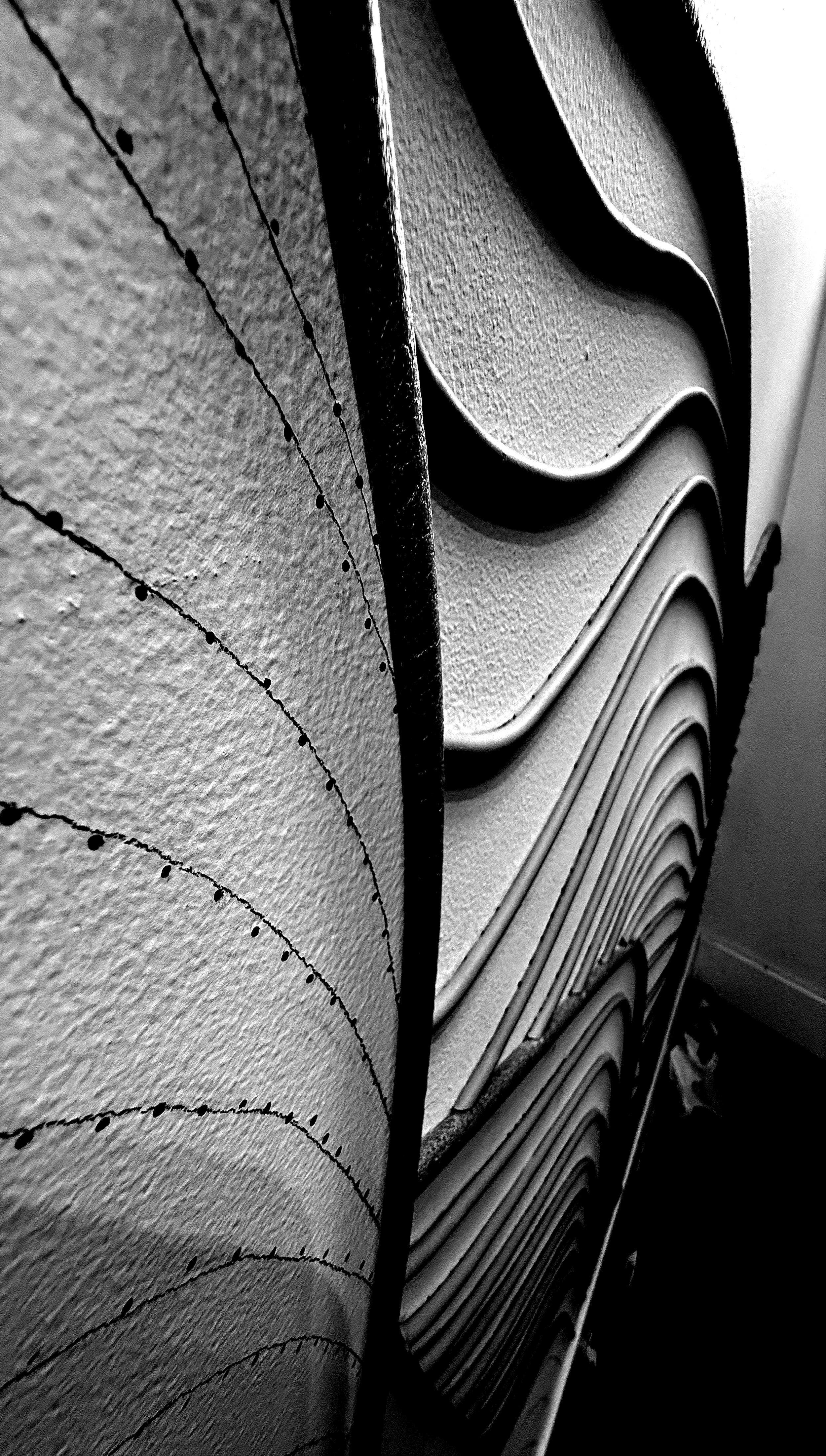 This wall sculpture took shape over several weeks, as I slowly traced what once was a little pencil doodle with cording, one inch at a time, one contour at a time, crest to trough to crest, finally applying a wash of white and dotting an illusory shadow in reflective liquid gold.