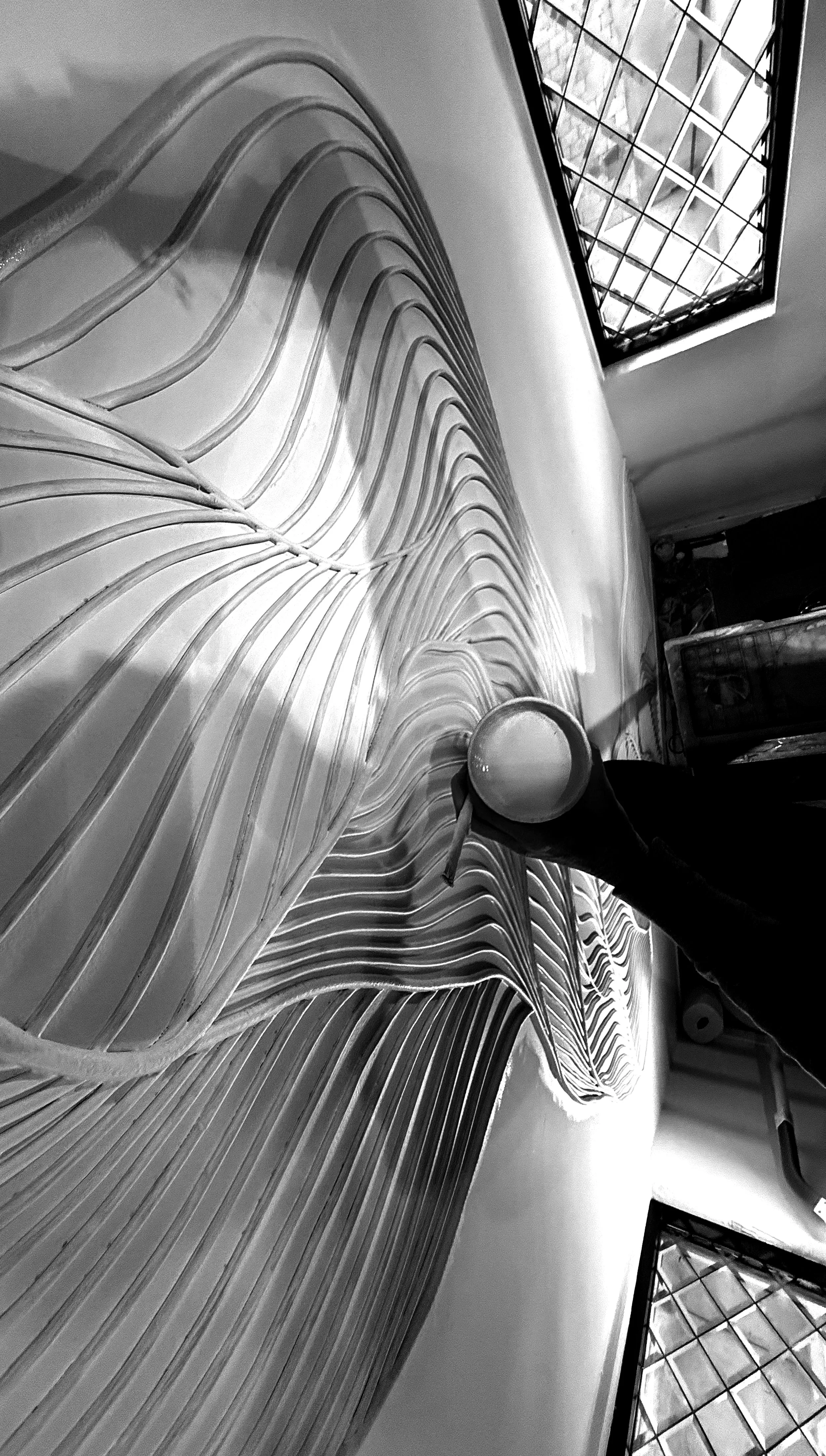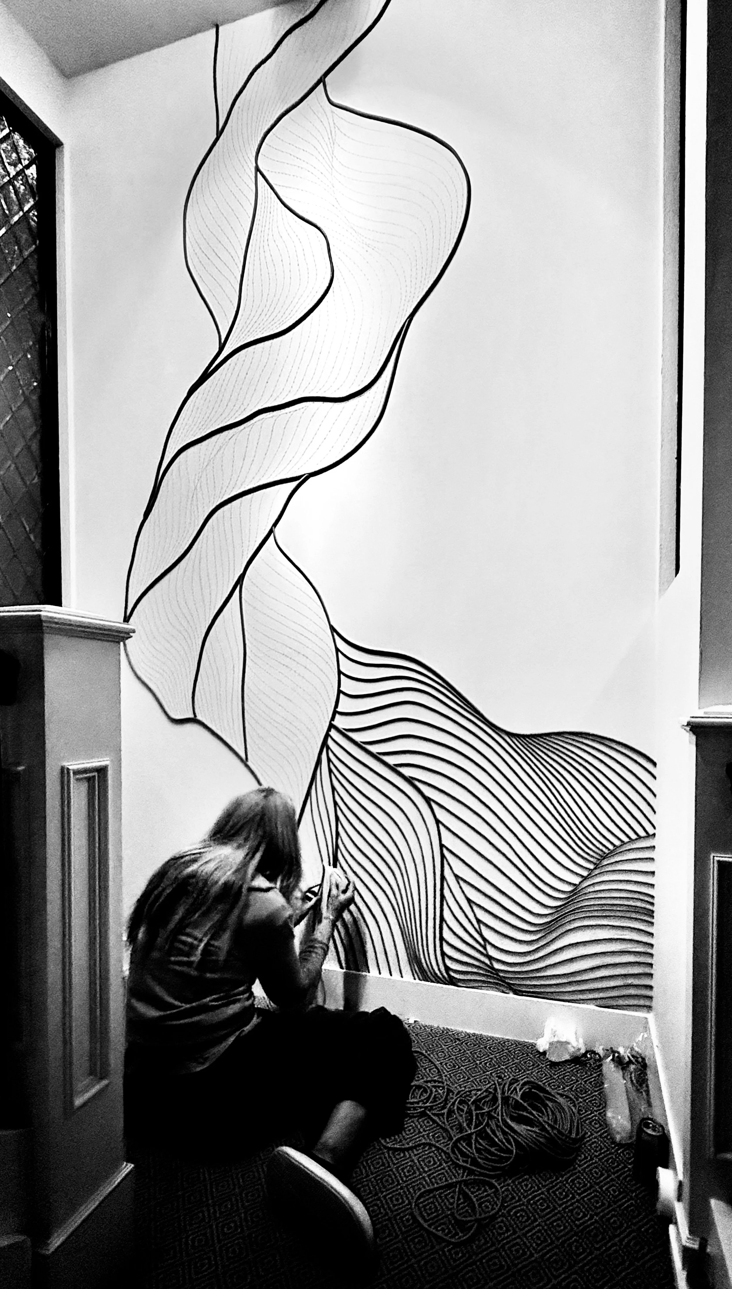 The day’s light pierced through the etched glass windows, stretching back and forth all day long, strumming the strings, pulling at the threads, egging me on. As this swelling sculpture evolved and built up its own momentum, so did I … finding my own equilibrium and balance, measuring my own determination and commitment to finally physically revealing this intangible notion living in my head.