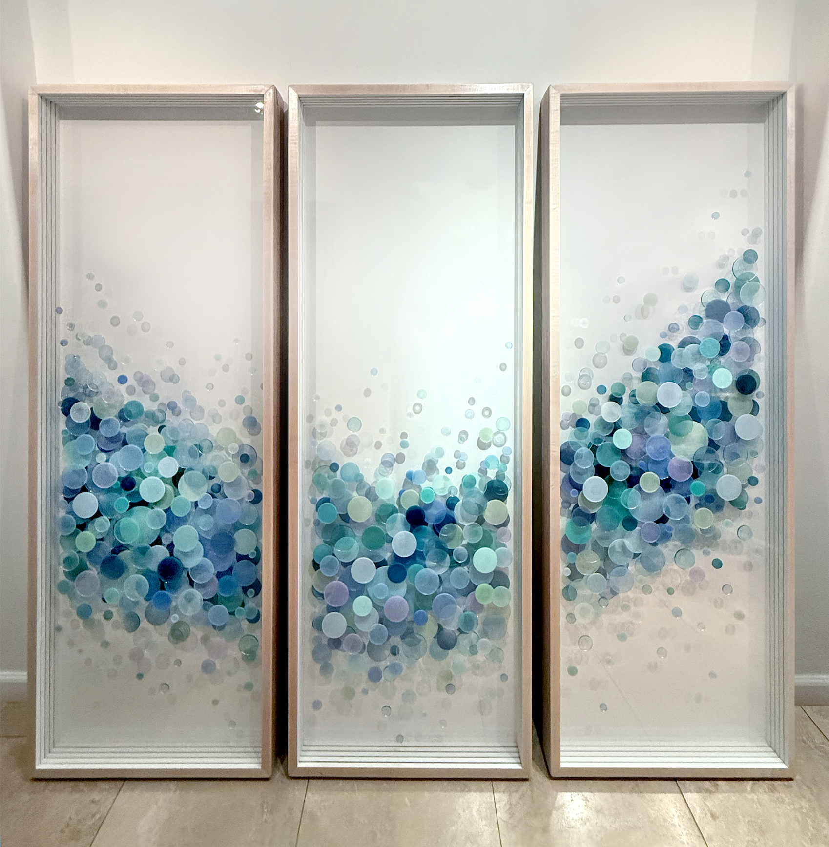So although disappointed, I regrouped and modified this commission to a wooden framed 4 layered triptych with the same theme of “Movement in Water”. The installation was moved to a yoga + wellness communal space. Although the original idea was innovative and exciting for me an artist, things happen and life causes us to pivot and shift and we must keep working and reworking ideas, never giving up. The key is maintaining the spark, the energy, the fever of creativity, and the clarity of vision throughout the twists and turns and ups and downs… because at the end of the day creativity never dies, it doesn’t get shelved… it persists, bubbling away just under the surface in spite of and often, if you’re lucky, because of life’s limitations.