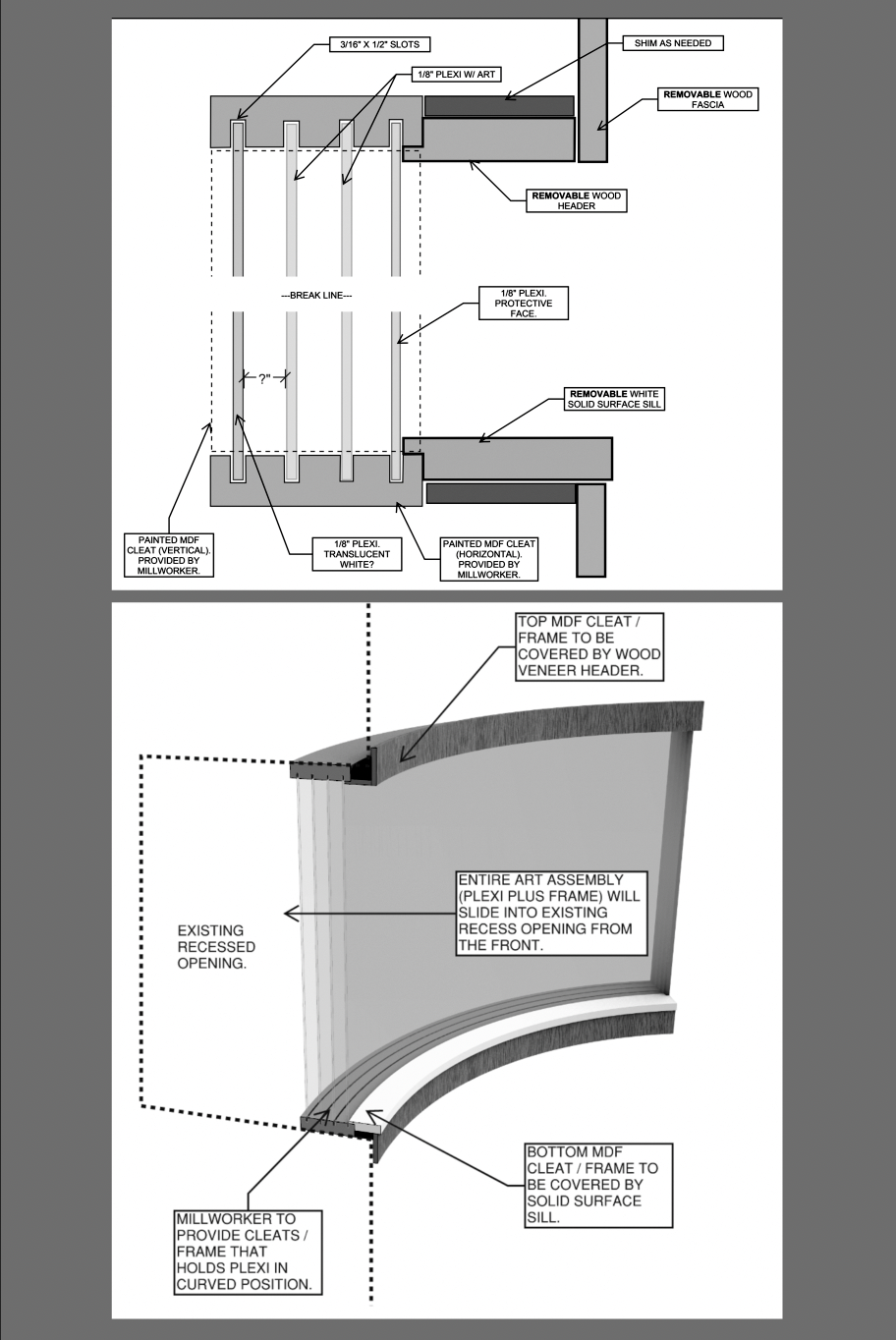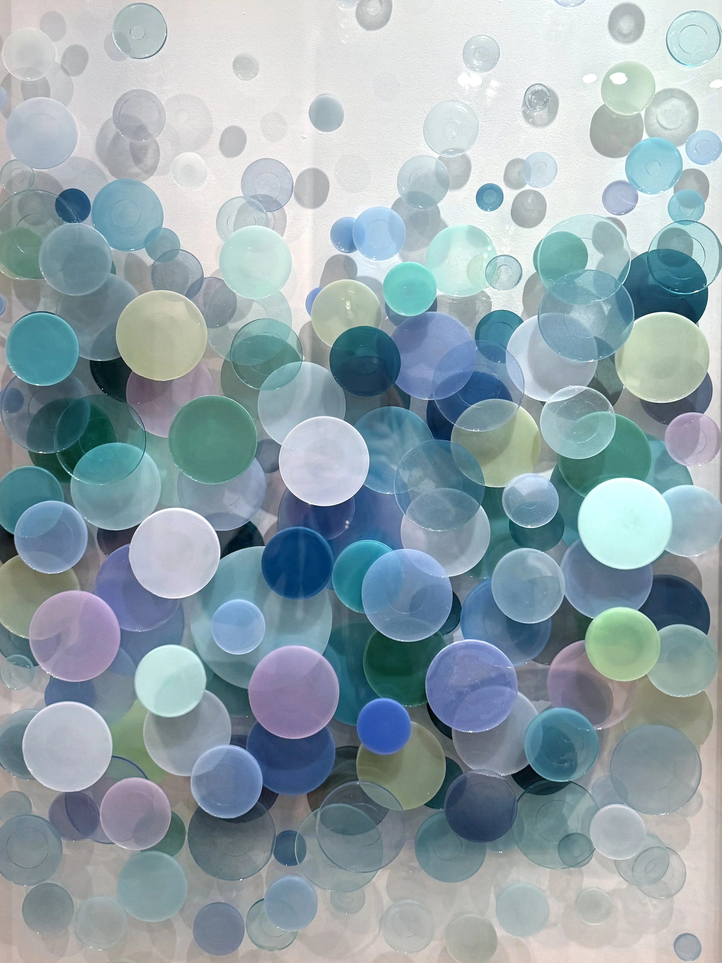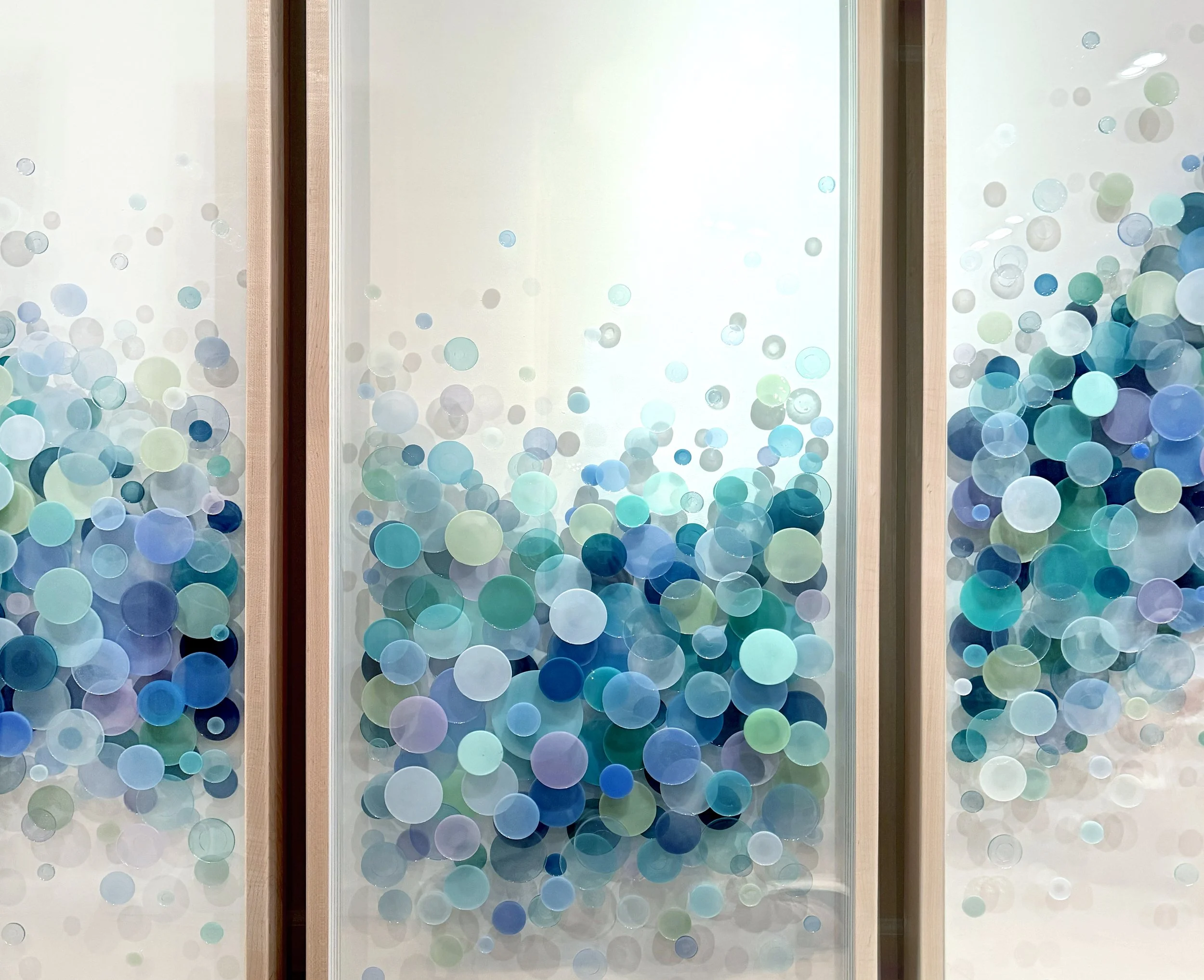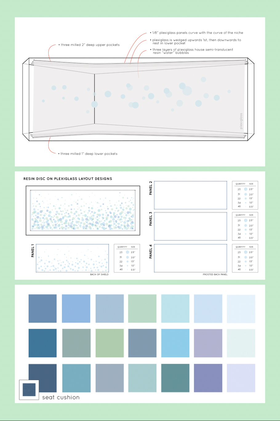 My proposal was to create thousands of marine-hued resin discs layered upon 4 long and flexible 1/8th” plexiglass panels to stretch from end to end of the nook in one smooth and gentle curve. The piece was to sort of “float” in a custom designed “cleat” (avoiding the barriers and limitations of a fixed frame) while being backlit with a custom designed linear LED band hidden from below.